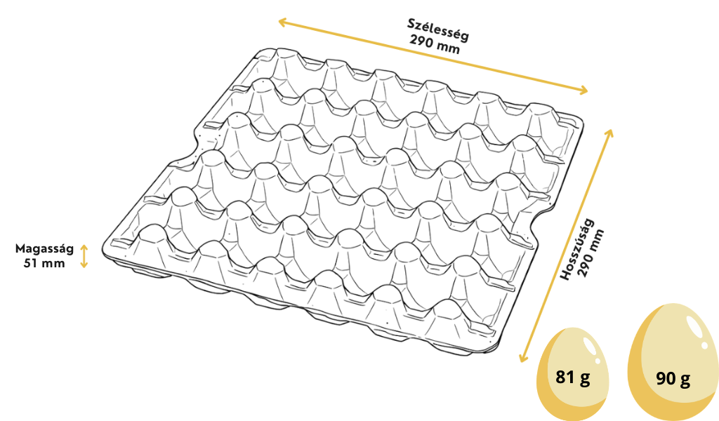 | 25 lbs Eiertray (20 Eier, 81–90 g) | 290 mm | 290 mm | 51 mm | 100 Stk. | 3600 Stk. | 1200 mm * 800 mm * 2820 mm |